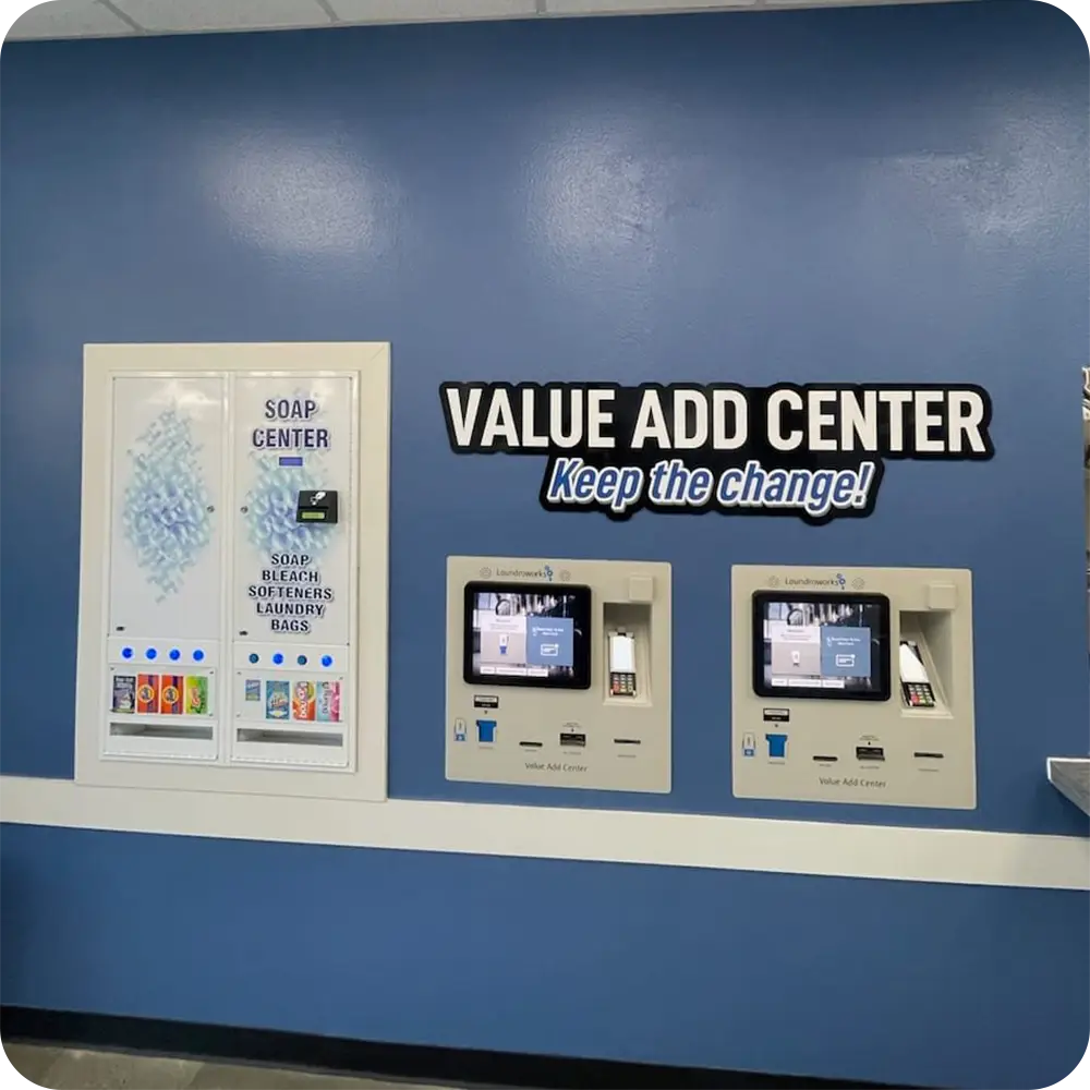 Laundroworks Kiosks (Value Add Centers) make doing laundry simple, fast, and hassle-free. These all-in-one stations let you start machines, load funds, and manage your laundry card using cash, card, or mobile payments — no more hunting for change or waiting around. Everything’s quick, secure, and easy to use, giving you a smooth laundry experience from start to finish.