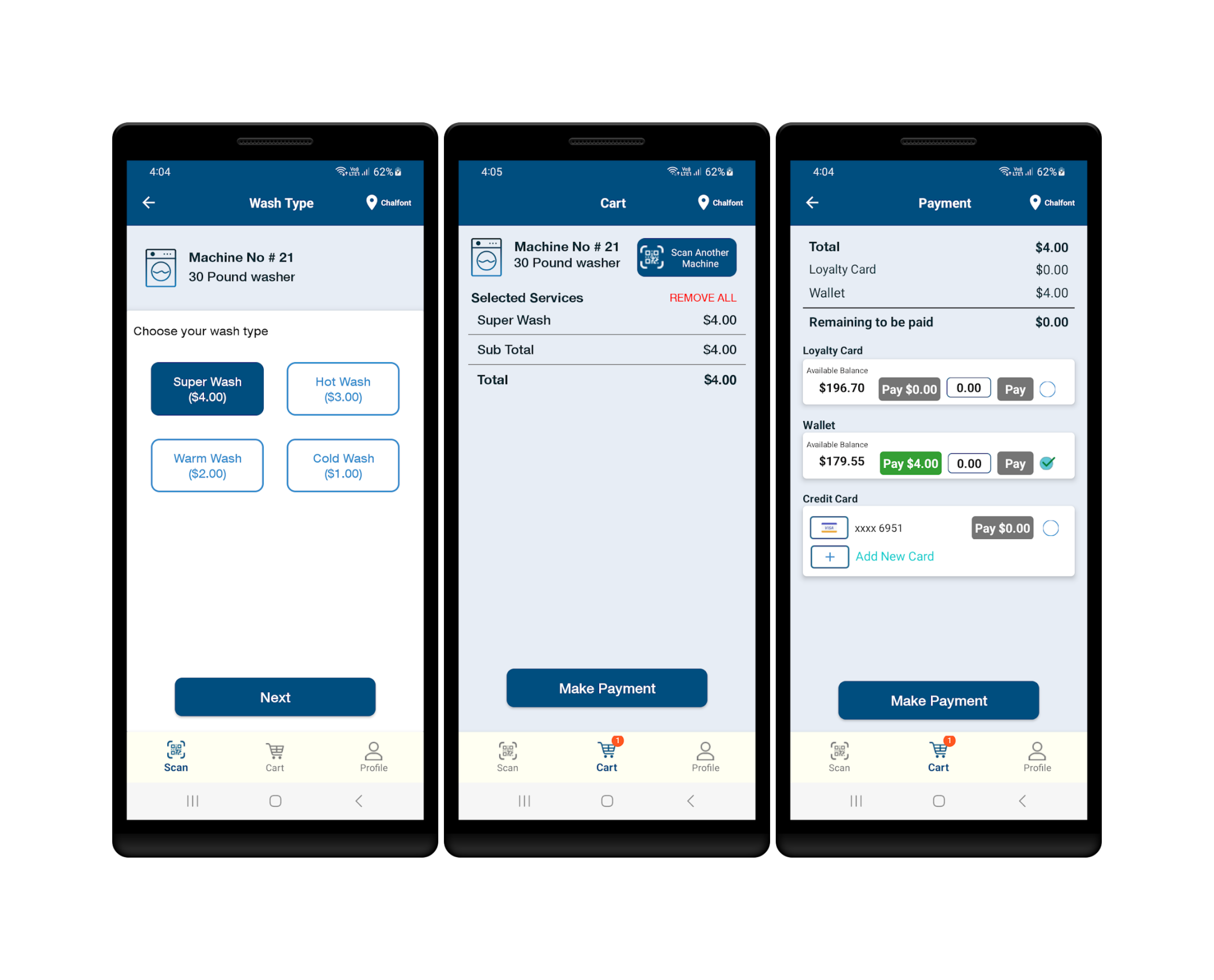 Add funds, manage your laundry with ease, and earn rewards every time you use the app!